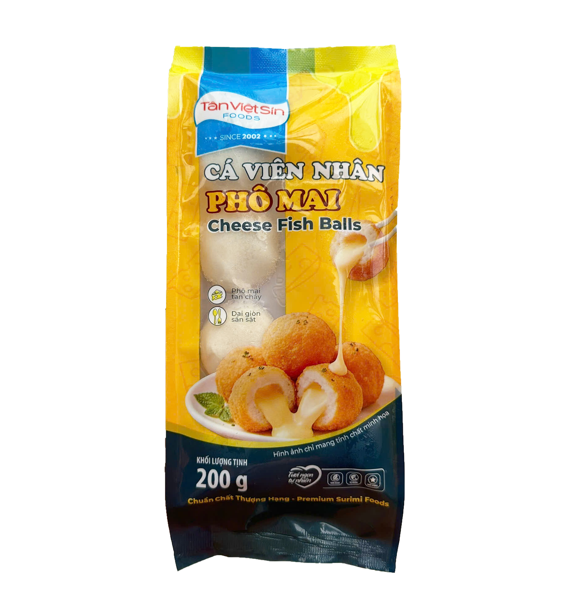 Surimi basa, phô mai (15%), nước, muối, đường, dầu ăn, chất điều vị (INS 621), chất bảo quản (INS 282, INS 262(i), INS 316, INS 471), chất ổn định (INS 450(iii), INS 451(i), INS 1412), chất tạo xốp (INS 500(ii), INS 341(i)), Tranglutamine, Carragenan, Trehalose, chiết xuất nấm men.Thời hạn sử dụng và hướng dẫn bảo quản: